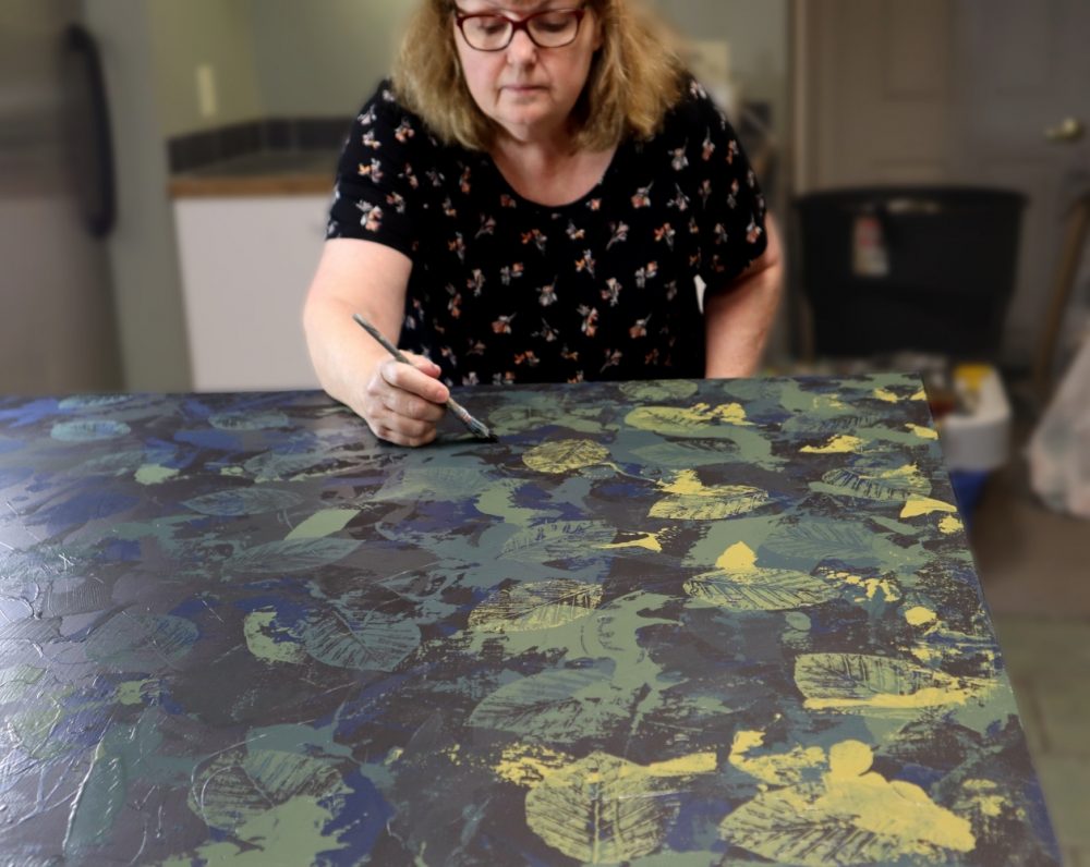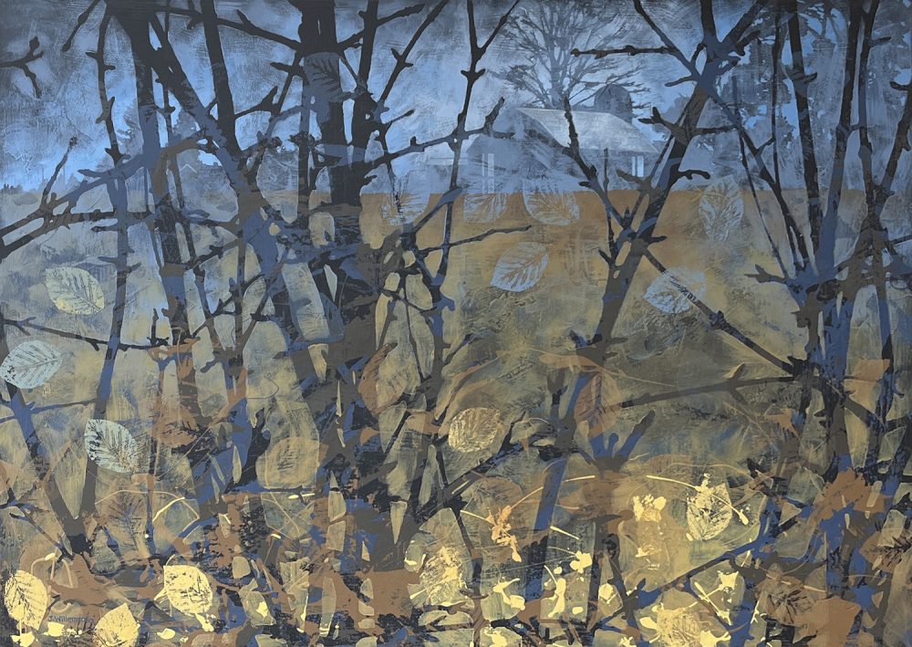 I use my collection of reference photos (and my computer) to compose and plan paintings. Once the planning is done, I head to my studio. I start my paintings with abstract colours and textures, then add silhouetted shapes and continue layering back and forth between abstract textures and representational shapes until the work feels finished.
